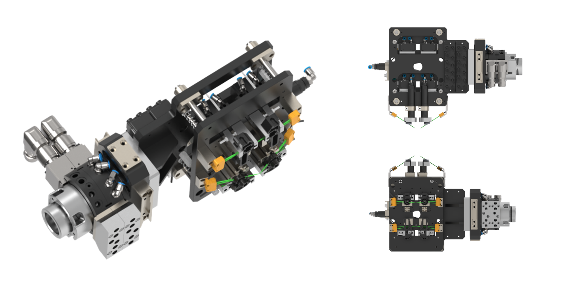 Gripper doble, diseñado a medida para aplicación de manipulación e inserción de componentes. Energías embarcadas con sistema de cambio rápido de herramienta. Reduce tiempos de operación al realizar carga y descarga con la misma herramienta
